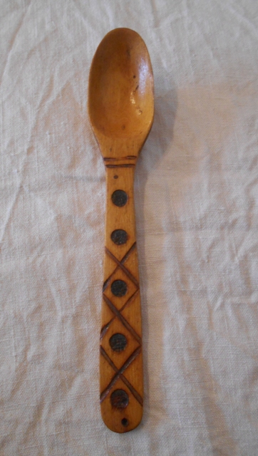 Lžíce, dřevěná, s lidovými motivy, dlouhodobě vystavená, nepoškozená. Lokace vzniku neznámá. S otvorem pro zavěšení.