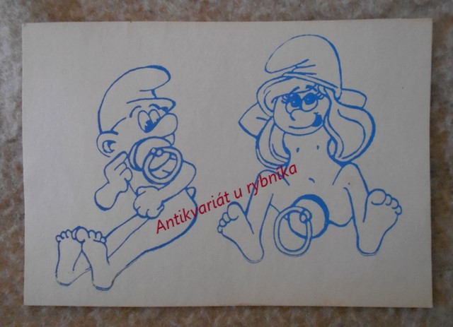 Drobná žertovná erotická kartička - Šmoulinka s dudlíkemSkladem 1 ks10 Kč/ ks
