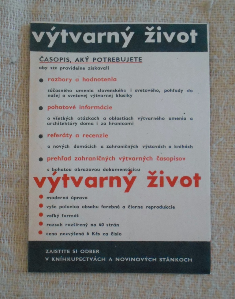 Dobová objednávka předplatného pro časopis Výtvarný život, Bratislava - rok neuveden, předtištěná 50. léta. Rozměry v rozloženém stavu A5, ve složeném stavu A6.