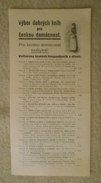 Reklamní propagační leták na knihy z Knihovny českých hospodyněk a dívek - nákladem I. L. Kobra v Praze. Rok vydání neuveden, 30. léta 20. století.