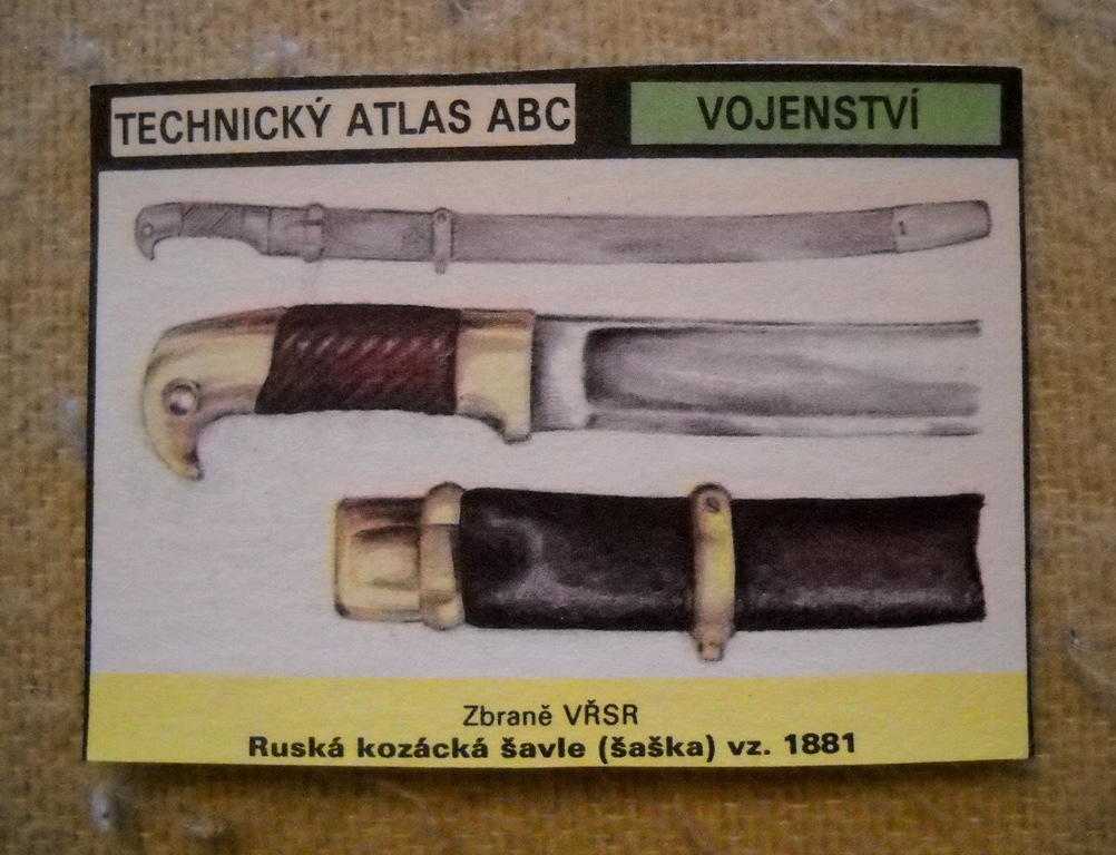 Technický atlas abc, záložka oboru Vojenství - karta Zbraně VŘSR - Ruská kozácká šavle ( šaška ) vz. 1881. Rok a číslo vydání neznámé.