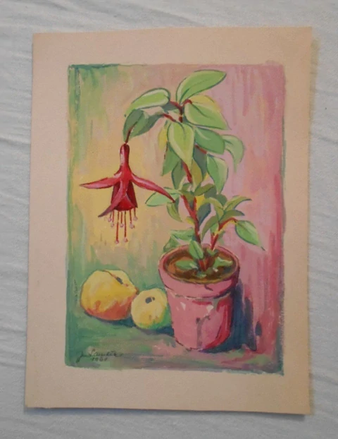 Zátiší s květem a ovocem, snad tempera ( bez záruky - jistě neolejové barvy a nepřelakováno ), polotuhý bílý papír. Signováno J. Samlík 1961 ( viz foto ). Originál, další původ neznámý.