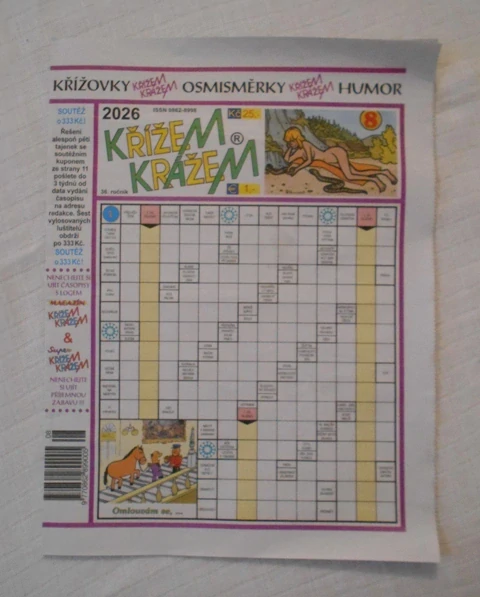 Křížem krážem, časopis křížovek a humoru 2026 8 ročník 36 - vydalo Křížem krážem, spol. s r.o., Praha 2026. Doporučená cena 25,- Kč. Vyšlo 7. 4. 2026.