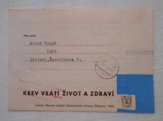 Originální Pozvánka k dobrovolnému bezplatnému odběru krve - vystavil Okresní ústav národního zdraví Poliklinka v Litovli, závodní ordinace n.p. Papcel - praktický lékař dne 13. června 1967. Formulářový lístek Krev vrátí život a zdraví vydalo Okresní ústředí zdravotnické výchovy Olomouc 1965, edice Zdravotnická osvěta. Předtištěný text s instrukcemi je podepsán MS ČSČK. Tiskařská značka formuláře 4 MTZ o 22 3794.