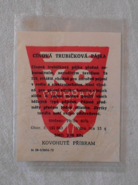 Příbalový lístek a návod Kovohutě Příbram - Cínová trubičková pájka - 70. létaSkladem 1 ks10 Kč/ ks