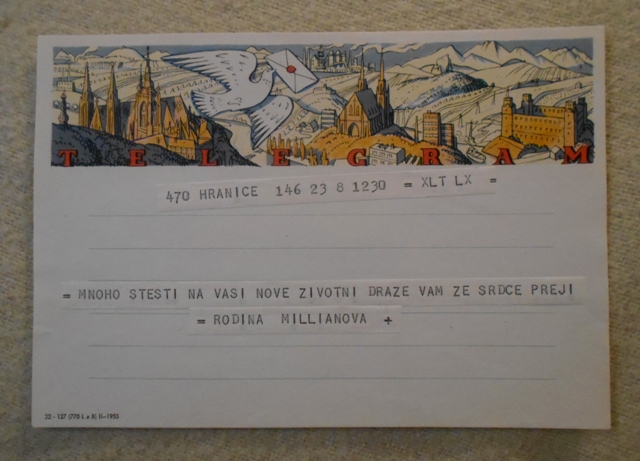 Telegram - ilustrovaný doručovací formulář použitý - doručený, Československo. Formulář vzor 22-127 ( 770 L x 8 ) II - 1955. Posláno ke sňatku v prosinci 1956. Autor ilustrace neuveden. Revers bez tisku.